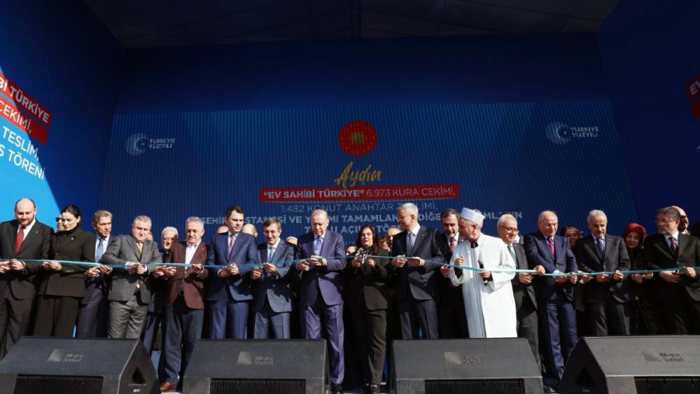 Cumhurbaşkanı Recep Tayyip Erdoğan, Aydın Büyükşehir Belediyesi önünde düzenlenen "Ev Sahibi Türkiye" 6 bin 973 Konut Kura Çekimi, 1482 Konut Anahtar Teslimi, Aydın Şehir Hastanesi ve yapımı tamamlanan diğer yatırımların toplu açılış törenine katıldı.